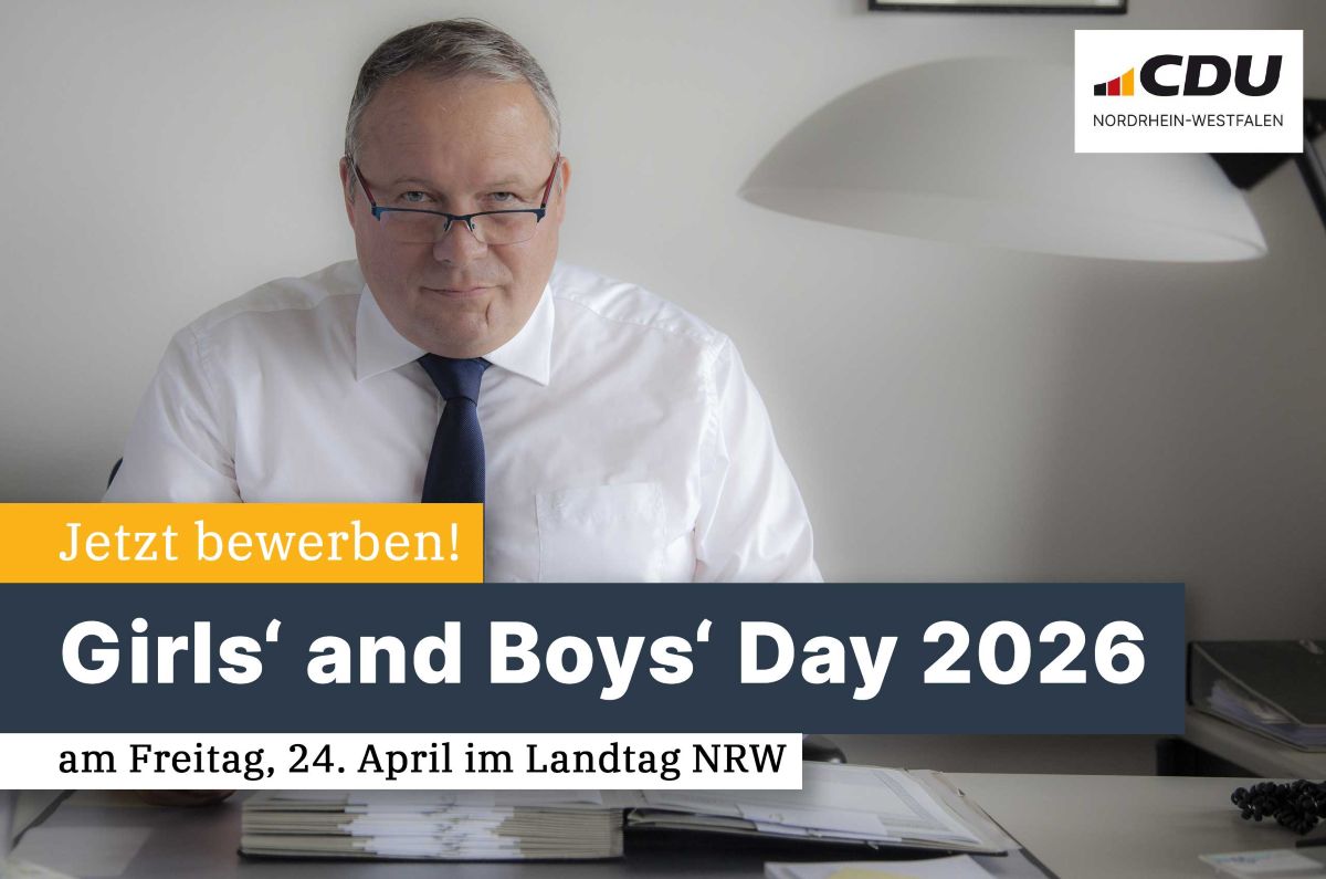 BERUFLICHE PERSPEKTIVEN Am Freitag, 24. April 2026, lädt der Landtag Nordrhein-Westfalen in Düsseldorf von 10:30 bis 14:30 Uhr zum Girls´ & Boys´ Day ein. Jugendliche der Klassen 7–13 können dabei Berufs- und Studienfelder jenseits von Rollenbildern kennenlernen – insbesondere in den Bereichen Technik, Handwerk und Naturwissenschaften.