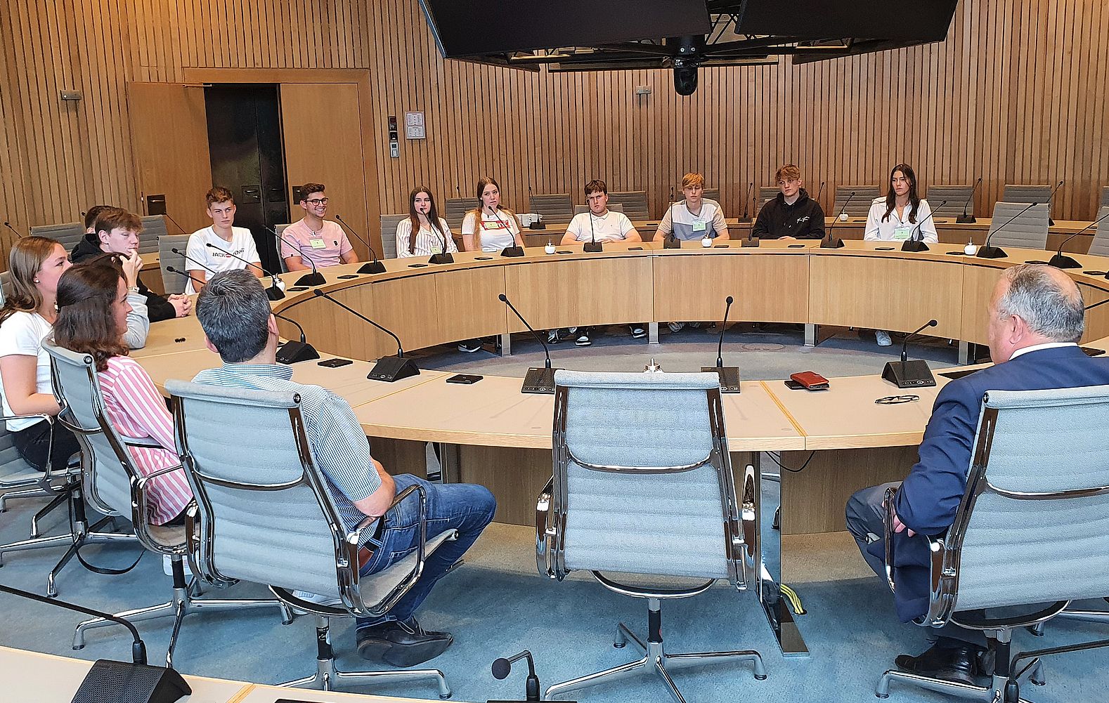 Nachdem die Schülerinnen und Schüler auf der Besuchertribüne des Plenarsaals die Debatte zur Gaskrise in Europa und Nordrhein-Westfalen verfolgen konnten, nahm sich Josef Hovenjürgen Zeit, um ihre Fragen zu beantworten.