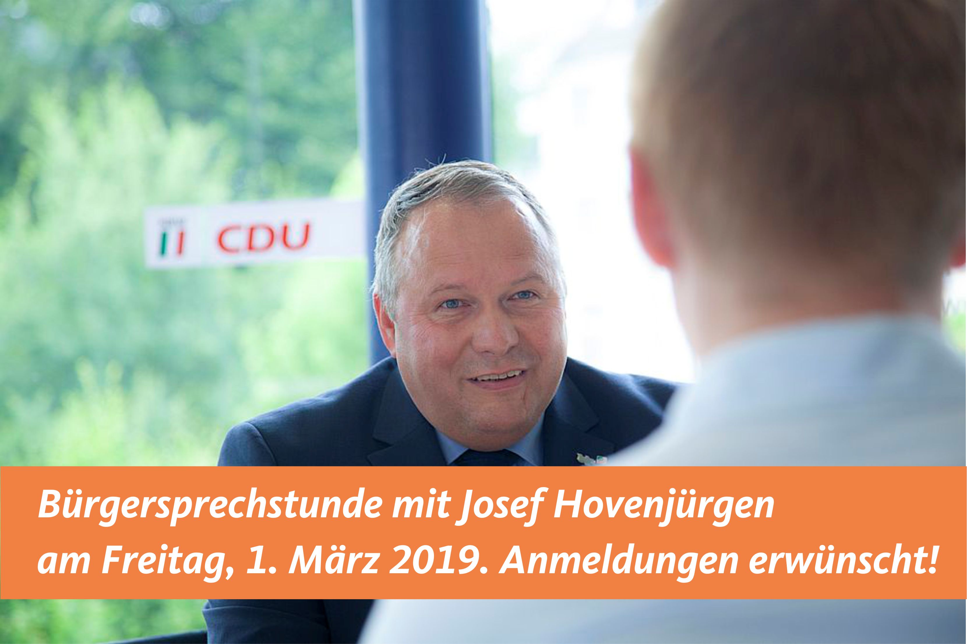 Zeit für ein Gespräch nimmt sich Josef Hovenjürgen für Sie: Am Freitag, dem 1. März 2019 haben die Bürgerinnen und Bürger wieder die Gelegenheit, den Landtagsabgeordneten Josef Hovenjürgen, von 15 - 17 Uhr im CDU-Stadtbüro in der Mühlenstraße 4, zu besuchen. Wer Rat sucht oder Informationen zu aktuellen politischen Themen wünscht, ist willkommen. Wir bitten um vorherige telefonische Anmeldung. Weitere Auskünfte erteilt das CDU-Stadtbüro unter der Telefonnummer 02364 12735.