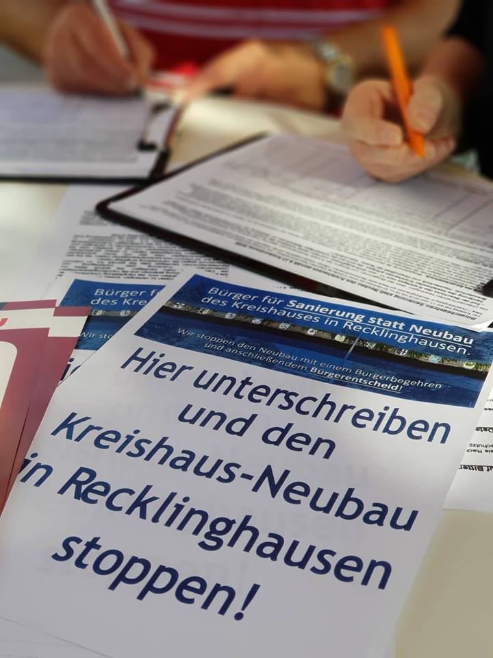 Kreis RE. Einstimmig hat der Kreistag in seiner heutigen Sitzung das Ergebnis des Bürgerbegehrens „Sanierung statt Neubau Kreishaus“ anerkannt. Damit ist das Bürgerbegehren für zwei Jahre für den Landrat und den Kreistag in seinen Aussagen bindend.