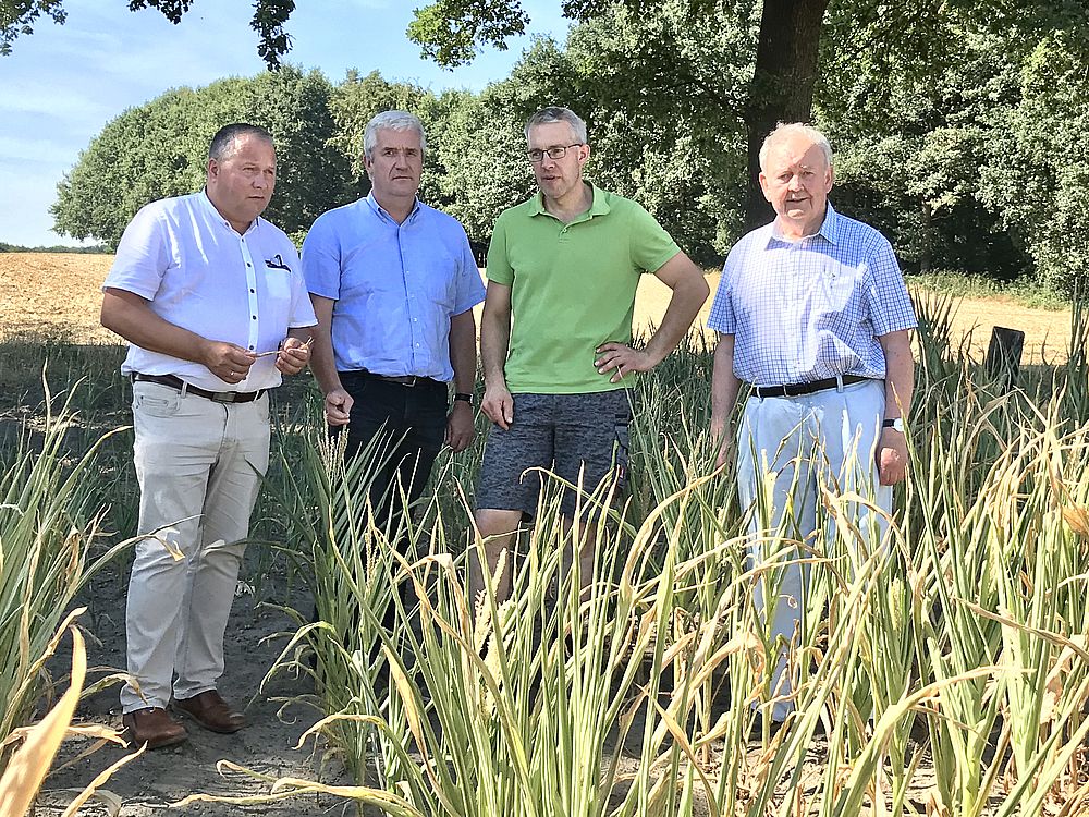 Hofbesuch: Der heimische Landtagsabgeordnete Josef Hovenjürgen machte sich auf dem Hof von Ortslandwirt Stefan Uhlenbrock zusammen mit Heinrich Heymink vom CDU-Stadtverband Oer-Erkenschwick und dem CDU-Ehrenvorsitzenden Josef Bakenfelder persönlich ein Bild von den Auswirkungen der Trockenheit.